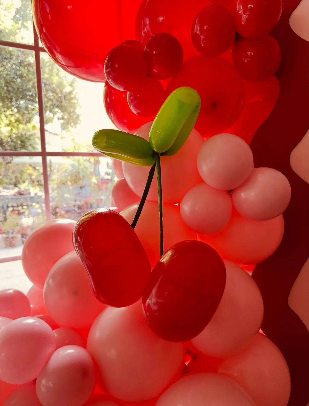 CHERRY BABY SHOWERBACKDROP INCLUDES:6 FT CUSTOM WAVY BACKDROPVINYL BIG RED BOW15 FT BALLOONS5 CHERRY BALLOONS